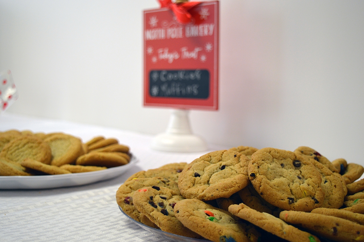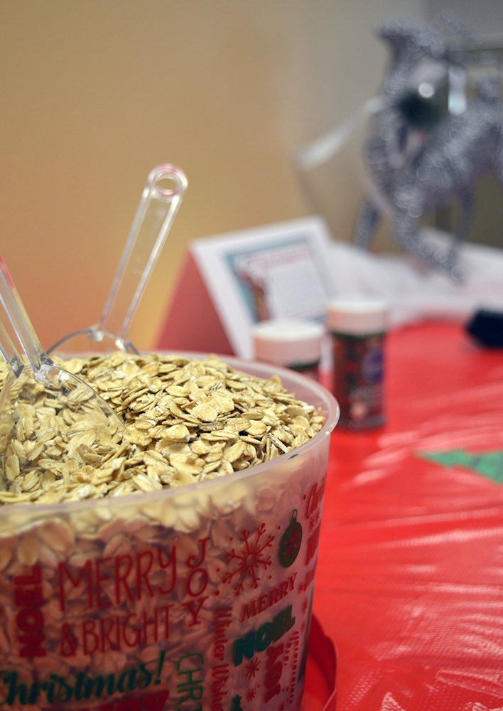 Setup began a few days ahead with the creation of a mini photo studio complete with Christmas tree, snowflakes, snow, and nice comfy chair for Santa Claus. Stacey and her children came by the office on Friday night to set up a beautiful, North Pole Christmas village that would greet all our guests as they arrived on Sunday to meet Santa. The morning of the event, we got several craft stations setup for the children to make reindeer hats, Christmas door hangers and picture frames, to bag up reindeer food, and write a personal letter to Santa, complete with a mailbox! We also had a table set up with goodies including cookies, muffins, and yummy hot chocolate.